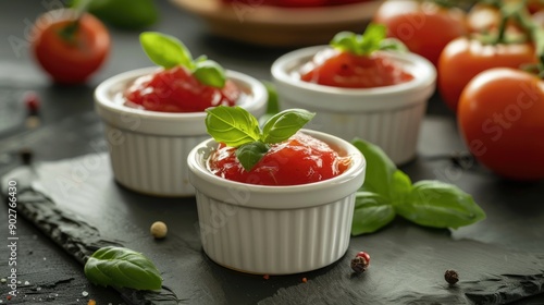 Three small bowls of tomato sauce with fresh basil leaves on top