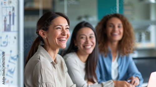 Three smiling women engaged in a friendly discussion, showcasing joy and collaboration in a modern workspace.