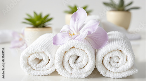 three soft white rolled towels with a pale purple orchid
