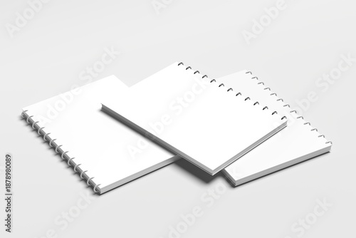 three spiral notebooks isolated on the background, with clean white covers, realistic look, overlapping each other