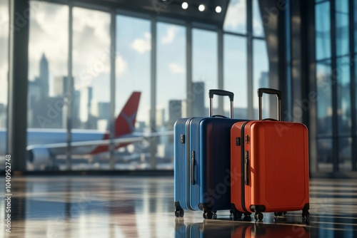 Three suitcases stand in an airport terminal, waiting for their owners, with an airplane and city skyline in the background.