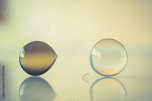 Three translucent orbs, two teardrop and one sphere, on a reflective surface. Pale light washes over all