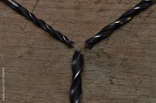Three used drills with their tips together. Focus is on the center of the image.