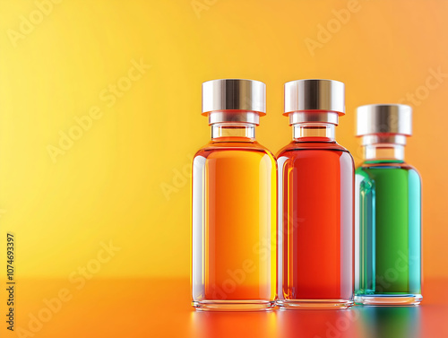Three vibrant glass bottles filled with colorful liquids against a warm, gradient background.