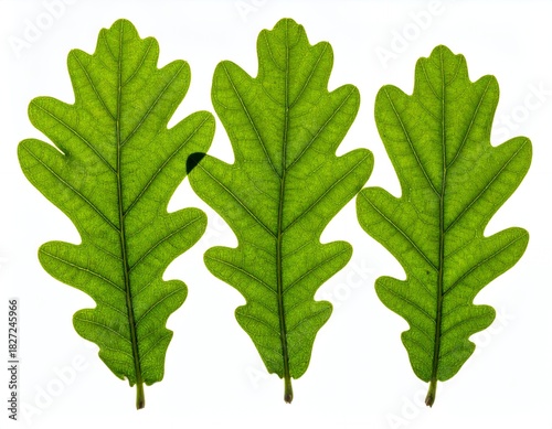 Three vibrant green oak leaves, showcasing their distinct lobed structure and fresh texture, isolated against a clean white background, perfect for botanical studies or nature-themed designs.