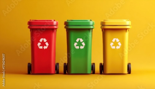 Three vibrant recycling bins in red, green, and yellow stand on a bright yellow background.
