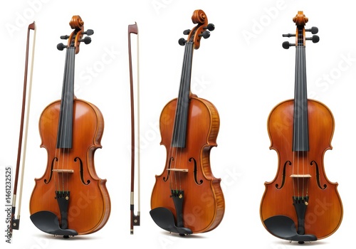 Three violins with bows displayed against a white background in varying angles