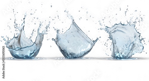 Three Water Splashes Creating Ripples On White Background
