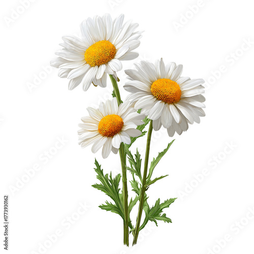 Three White Daisies with Yellow Centers isolated on a transparent background 1