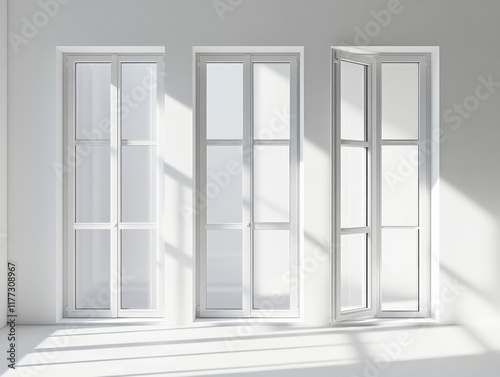 three white doors in a white room with shadows