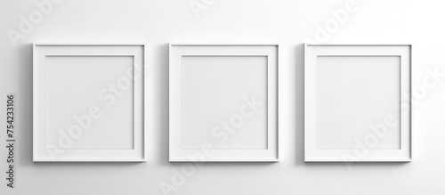 Three white frames are mounted on a white wall, creating a minimalist and clean aesthetic. The frames are empty, ready to display artwork or photographs.