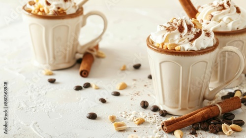 Three white mugs filled with creamy coffee topped with whipped cream and cinnamon sticks, surrounded by scattered coffee beans and nuts on a light background. Cozy autumn treat.