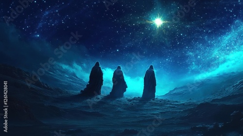 Three Wise Men Journeying Under a Guiding Star Across a Mystical Desert Landscape