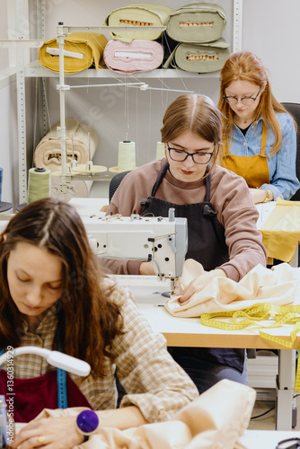 Three women sew in workshop at clothing factory. industrial equipment sewing machines. women are professional tailors. scene is calm, focused. work on creating a collection of clothes for sale online.
