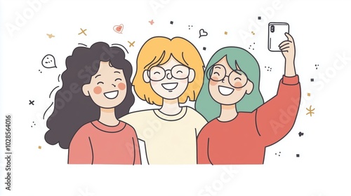 Three women taking a selfie, against a white background, with a simple design featuring flat color blocks and simple lines.