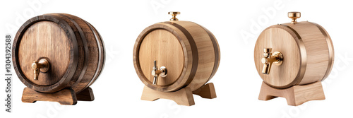 Three wooden barrels with taps, showcasing a rustic design and varying sizes, ideal for beverage storage.