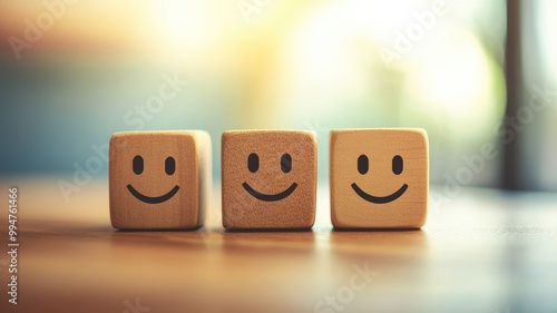 Three wooden cubes with smiling faces on table, representing happiness, positivity, and joy