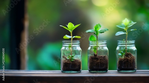 Three Young Plants Growing In Glass Jars, Representing Growth And New Beginnings.