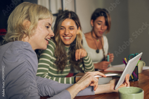 Three young women collaborating with digital tablet at table indoors