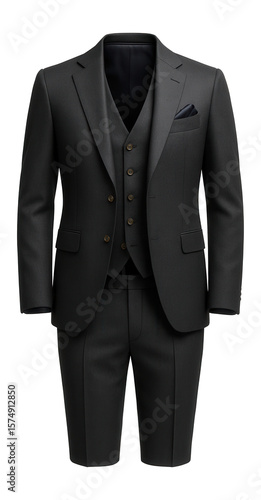 Three-piece charcoal gray suit with a slim-fit cut and notch lapel for formal events