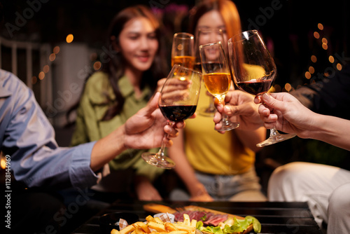 Throw a party Celebrate whiskey at a friendly party in a restaurant. Night.