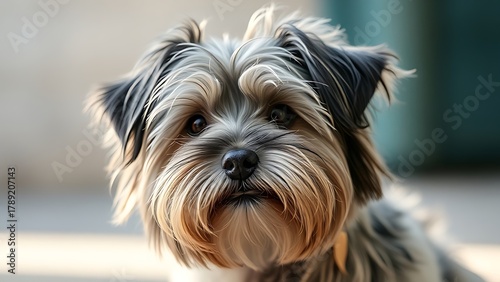 Tibetan terrier with fluffy coat, portrait with natural side lighting.