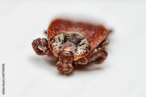Tick over white background. Tick is the common name for the small arachnids in superfamily Ixodoidea that, along with other mites, constitute the Acarina. Dermacentor reticulatus