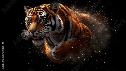 Tiger leaping, dark background, sparks, wildlife