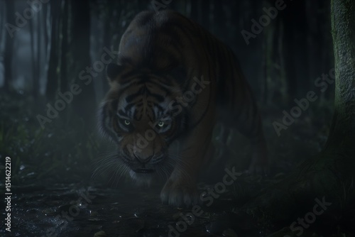 Tiger prowling in mysterious dark forest