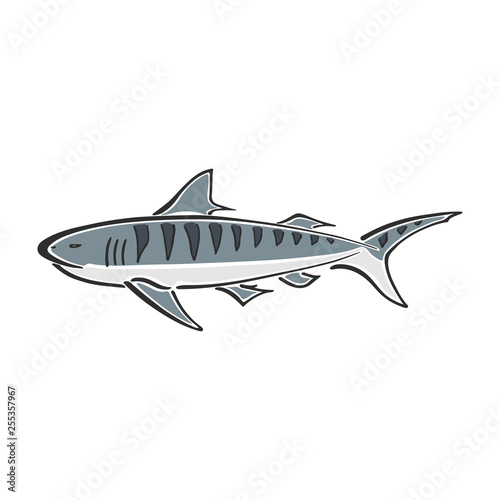 Tiger shark character abstract ink hand drawn vector logo cartoon. Simplified color illustration. Ocean blue. Sea animal curve paint sign. Doodle sketch. Element for design, wallpaper, fabric print.