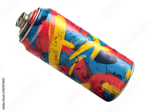 Tilted Spray Paint Can with Multicolor Graffiti Pattern and Cap On, Angled Side View, Isolated on Transparent Background