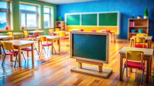 Tilt-shift miniature classroom; an empty blackboard provides a charming, tiny-world educational backdrop.