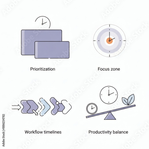 Time Management and Productivity: Visuals of effective techniques for prioritization, focus, timelines, and balance.