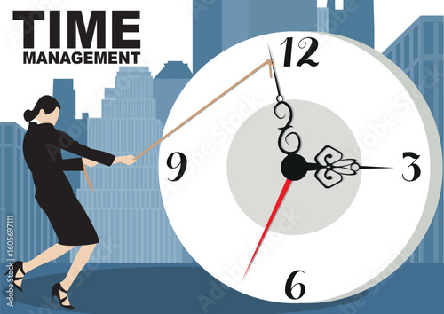 Time management concept banner. Use for web banner, info graphics, hero images. Flat vector on boarding illustration isolated on city background.