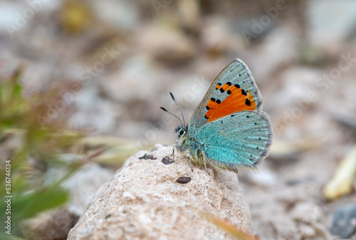 Tiny blue butterfly on plant, Romanoff's Tomares, Tomares romanovi