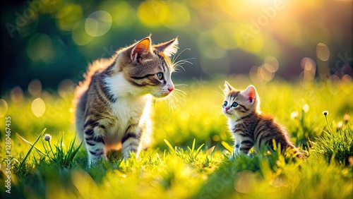 Tiny kittens playing in the grass, a whimsical tilt-shift scene.