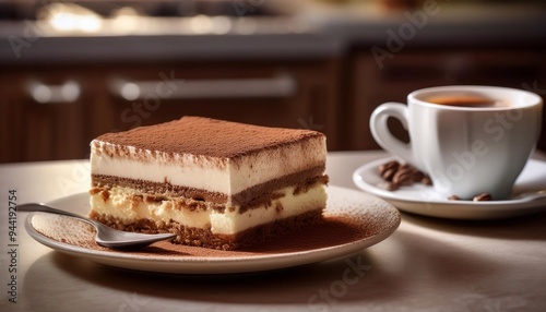 tiramisu on a plate with a cup of coffee on the table against a yellow bokeh background with lights.