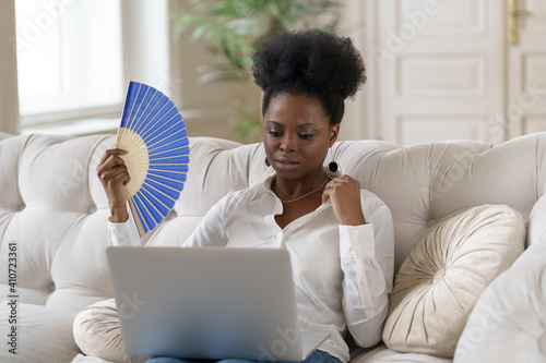 Tired Afro business woman suffering from heatstroke or hot summer flat without air-conditioner, touching her forehead, using waving fan, working on laptop, sitting in living room at home. Overheating