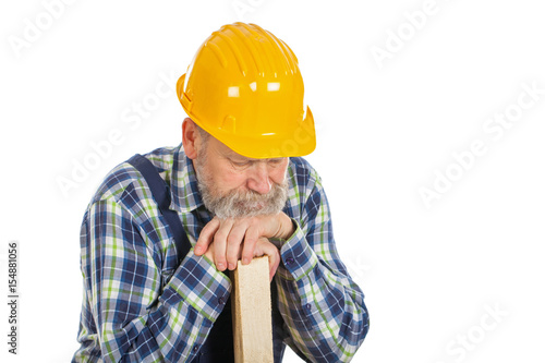 Tired male engineer holding a lath - isolated background