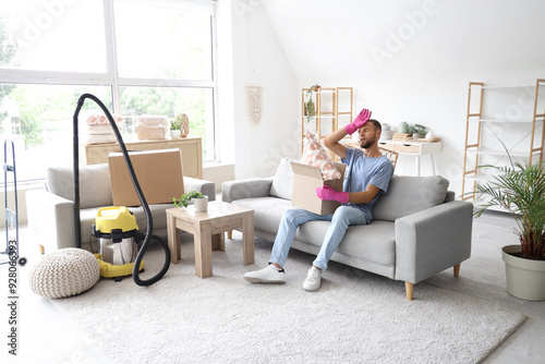 Tired male janitor holding cardboard box and sitting on sofa in room