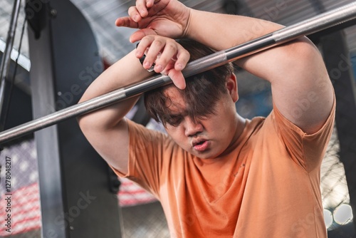 Tired overweight man exercising in gym exhausted after workout fitness environment