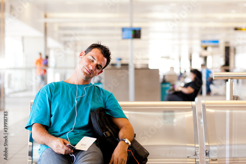 tired young male traveller sleeping in airport