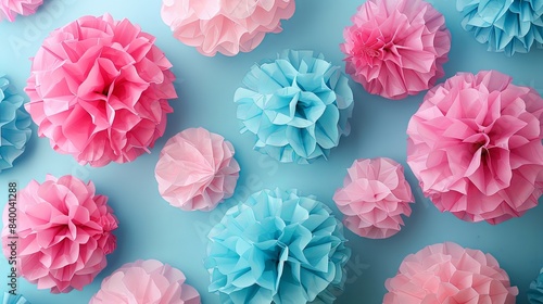 Tissue paper balls in a pink and blue colors. Gender reveal party concept. Creative background