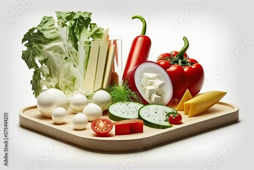To the right is a platter of fresh vegetables, including tomato, cucumber, onion, spinach, lettuce, and sesame. Dietary plan. Impressive perspective. Generative AI