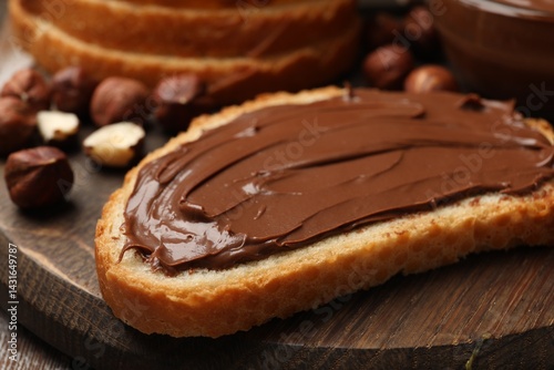 Toast with chocolate hazelnut spread and nuts on table, closeup