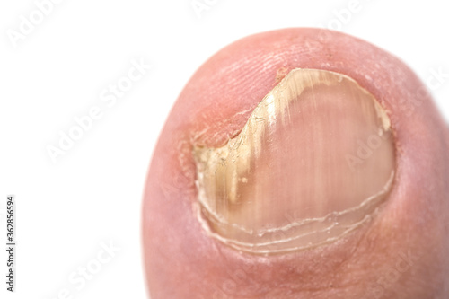 Toenail fungus close up with a human foot isolated on white background