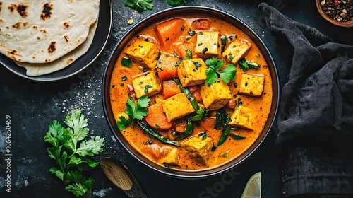 Tofu and Vegetable Curry in a Black Bowl with Garnish