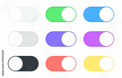 Toggle switch buttons set. On and off. Black, gray, white and colorful switch interface buttons. Template design for concepts, web, ui and ux, mobile app. Vector illustration