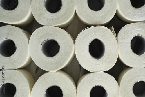 Toilet paper in a roll. Snow-white soft three-layer toilet paper. Lack of hygiene products. Primary protection and disinfection.