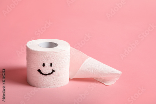 Toilet paper roll with happy smile on pink background